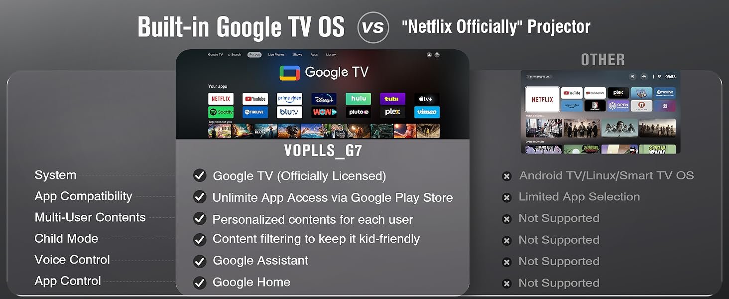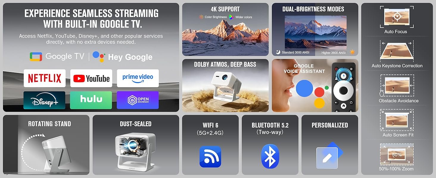 【Built-in Google TV Ecosystem: Vast Streaming & Personalized Profiles】 As the VOPLLS G7 flagship projector, it features the certified Google TV system with vast content at your fingertips. Fully compatible with Netflix, Disney+, Prime Video, Hulu, etc., no extra devices needed. Download thousands of apps via Google Play and access 800+ free live channels. Create personalized profiles for each family member with a Kid-Safe mode to filter content and manage time. Whether you are an android projector or a phone projector user, enjoy flagship-level personalized entertainment on this google tv projector and netflix projector. 【Intelligent Dual-Brightness Modes: Your Choice of Brilliance or Silence】 This smart projector offers intelligent choices. The Standard Mode (3000 ANSI) operates at an ultra-quiet level, perfect for indoor projector scenarios. Switch to the High Brightness Mode (3600 ANSI) for a brighter, more vivid picture suitable for living rooms or as a backyard projector for a more immersive viewing experience. You are in control of choosing between brilliance and silence. 【Professional Sealed Optical Engine: Dust-Proof Design for Lasting Purity】 As a reliable home theater projector, we have upgraded to a professional sealed optical engine. It completely solves the pain point of traditional open engines being prone to dust and dark spots, ensuring your digital projector delivers consistently pure image quality throughout its lifespan. Whether used as a fixed ceiling projector or a projector for bedroom, it is a long-term investment you can trust. 【Voice-Controlled Home Theater: Just Ask to Watch】 Press the voice button and command your theater naturally. Say, “Lower volume,” or “What’s the weather?”—the built-in Google Assistant understands and acts. Search movies, launch apps, control smart devices—all hands-free. This makes it the most convenient projector with apps for scenarios from camping projector to travel projector. 【Powerful Dual 8W Speaker System with Dolby Audio】 Fully upgraded audio! Equipped with dual 8W speakers (up from 5W) and dual diaphragms, it delivers a more powerful soundstage and deeper, richer bass. Combined with Dolby Audio technology, enjoy immersive sound that puts you in the center of movies and games, making this gaming projector and movie projector the core of your entertainment. 【Cinema-Quality HDR Visuals, 4K Decoding & Flexible Projection】 With HDR10 support, it reveals richer contrast and vibrant colors. The 98% wide color gamut delivers near-Hollywood accuracy. The powerful system smoothly decodes 4K UHD content from streaming apps, presenting it in superb 1080P Full HD. The portable design allows for multi-angle rotation for easy ceiling projection or finding the perfect outdoor viewing angle, maximizing the potential of this outdoor projector and indoor projector. 【Fully Automatic Setup with 50%-100% Digital Zoom】 No more manual adjustments! With Auto Focus, 6D Keystone Correction, Obstacle Avoidance, and Screen Fit, it delivers a perfect image in seconds. The Digital Zoom allows flexible sizing from 50% to 100%, perfectly fitting any screen or wall without moving the projector. This makes setup of this portable projector simpler than ever. 【All-in-One Wireless Connectivity Hub】 Your wireless entertainment hub. Features Wi-Fi 6 and supports AirPlay, Miracast, Chromecast for one-tap casting from iPhone/Android/PC/Mac. Bluetooth 5.2 works for headphones or as a standalone speaker. Versatile ports (HDMI/USB/Audio) allow direct connection to game consoles (PS5/Switch), laptops, USB drives, or speakers. This is a fully functional projector with wifi and bluetooth and wireless projector, as versatile as described by proyectores 4k bluetooth wifi. 【Brand Trust, Full-Scenario Solution & Worry-Free Support】 Choosing the voplls projector means choosing quality and a comprehensive experience. It integrates multiple scenarios, from the exquisite picture quality of a proyector 4k ultra hd (4K UHD projector) to the flexibility of a proyector portátil (portable projector), and the full functionality of a proyector (projector) itself. We provide a 3-year warranty and lifetime customer support to ensure your investment in home theater projectors is secure for years to come. %$#