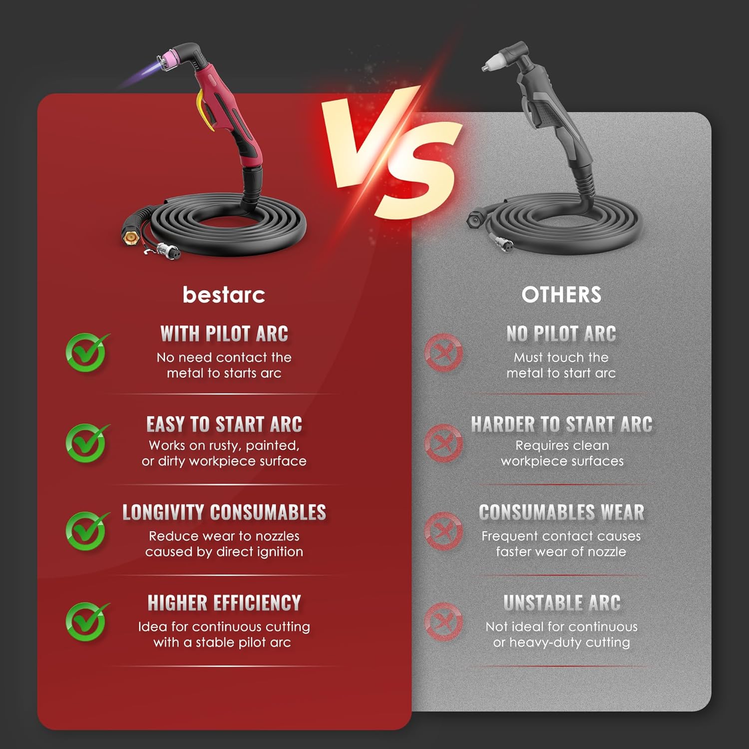 Included Components | Built-in Regulator, Air sensor, Plasma cutting torch, Portable, 20mm Max cutting thickness @220V 65PSI, Set up within 1 min, Easy to use, Powerful performance |