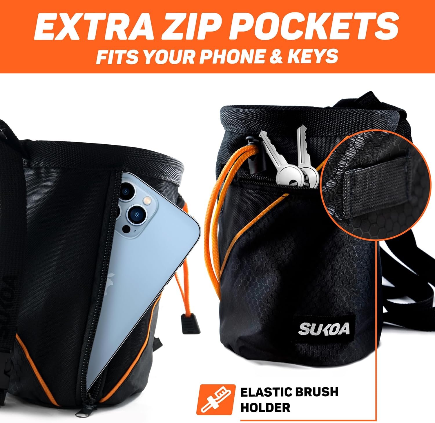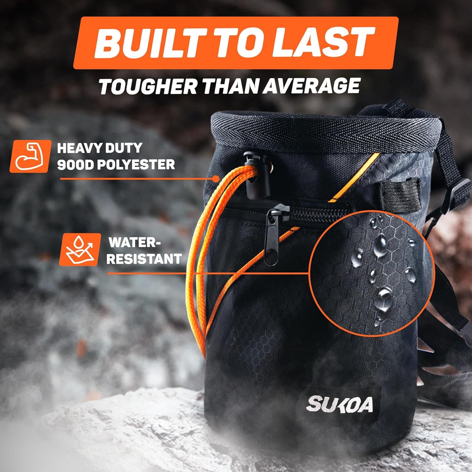#$% Elevate your rock climbing, weightlifting, bouldering, gymnastics, or gym workout experience with the Sukoa Chalk Bag for rock climbing, designed for convenience and performance. Featuring an adjustable quick-clip belt and two loops for easy attachment to harnesses or carabiners, this bag ensures seamless access to your chalk during every adventure. It has two large zippered pockets so you can securely store IDs, keys, cards, or even large phones. The spacious main compartment accommodates larger hands, allowing for hassle-free chalking during climbs. An adjustable draw cord secures tightly, preventing chalk spills and keeping your rock climbing gear accessories and car clean. Made from premium-quality 900D polyester & water-resistant fabric, this rock climbing chalk bag is built to last. Ideal as rock climbing gifts, the Sukoa Chalk Bag ensures maximum performance. Order Now. Chalk Bag For Rock Climbing, WeightLifting, Bouldering, Workouts at the Gym, CrossFit & Gymnastics. Engineered for durability in extreme environments, this lightweight bag has reinforced stitching and waterproof fabric. Also comes with a quick-clip belt for easy wearing & two loops for seamless attachment to harnesses or carabiners – convenience & performance for all your adventures. Two Large Zippered Pockets & Plenty of Storage. Heavy duty zipper pockets are perfect for securely storing IDs, keys, cards & large phones. Designed for easy carrying, these are the ultimate rock climbing gear accessories – ensuring you’re always ready to capture & share unforgettable moments. Adjustable, Quick-Clip Waist Belt For A Perfect Fit. Tough belt extends up to 40 inches to fit most waist sizes, with handy drawstring cord that secures tightly and prevents chalk spills. Keep car & gear clean with climbing chalk bags that ensure chalk stays inside the bucket. No more money & weekends wasted cleaning out messy back seats. Spacious Fleece-Lined Main Compartment for Big Hands. This indoor & outdoor rock climbing chalk bag is soft to the touch and has a large opening that accommodates larger hands, allowing you to focus on maneuvering tough climbs instead of fumbling with small compartments. Maximize performance, not hassle. Premium-Quality Rock Climbing Gifts For Beginners & Experienced Climbers. Made from water-resistant material, 900D polyester fabric and high quality materials, Sukoa Chalk Bag is a tough, rugged chalk bucket that will last for years to come. Available in a range of colors to suit your personal style. Order Now. %$#