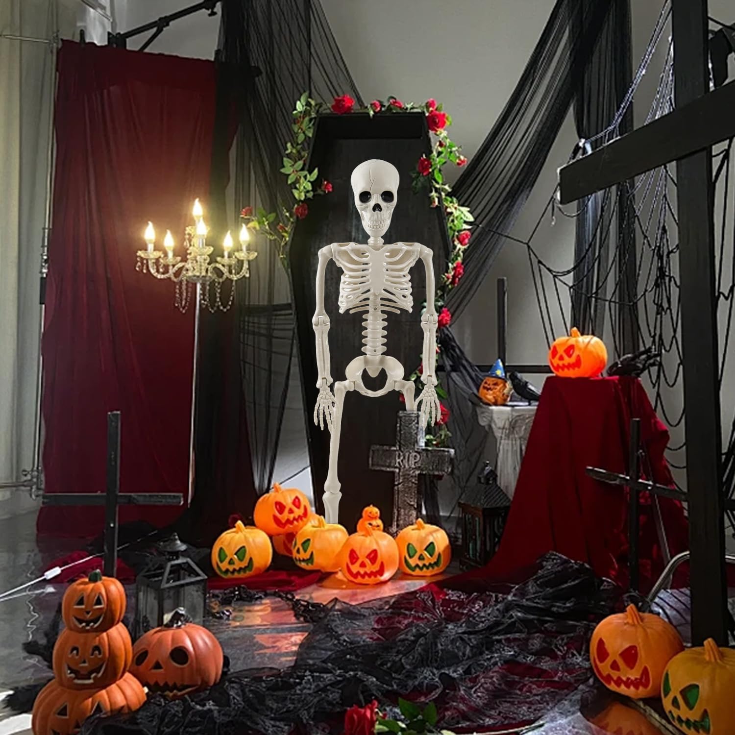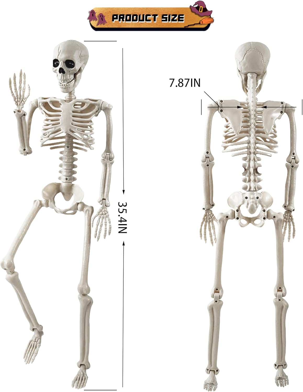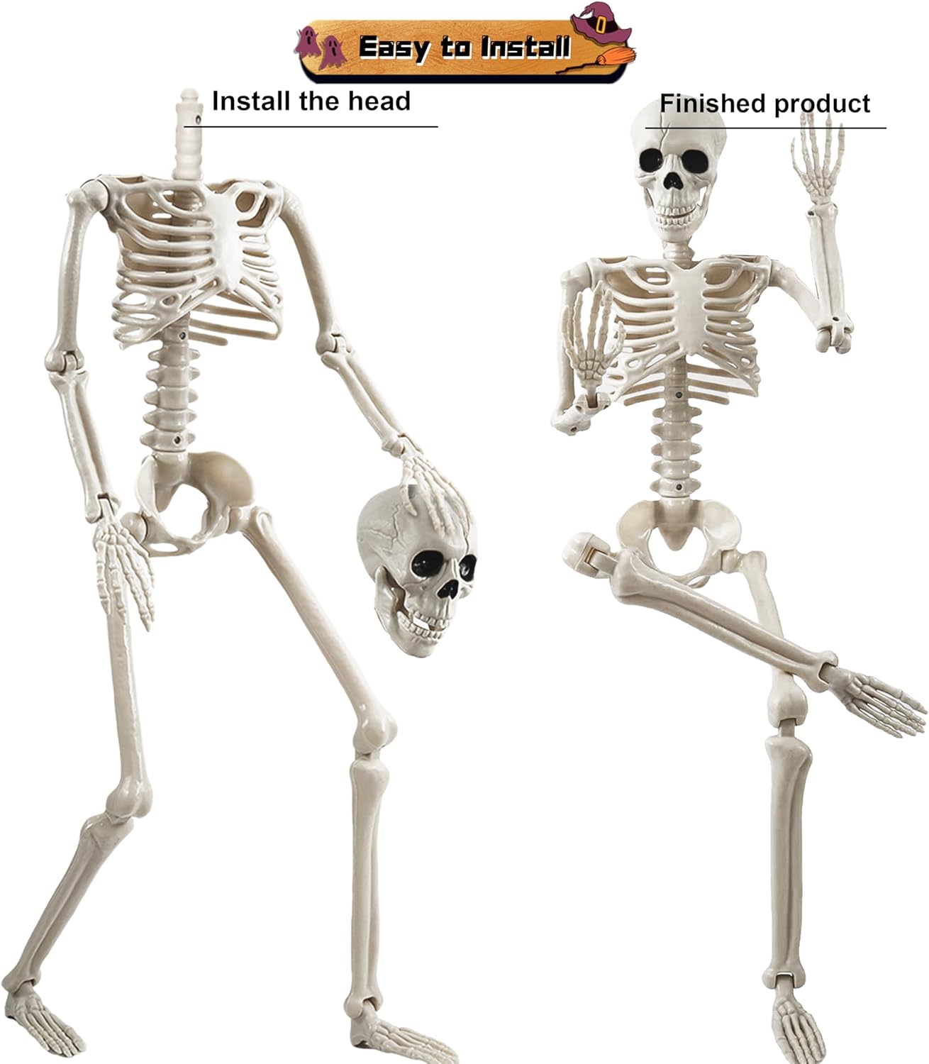 Easy Assembly & Highly Posable: Simply attach the skull to the neck connector—no tools needed! The flexible joints allow you to reposition the skeletons in various poses: sitting, standing, kneeling, and lying down. Ideal for creative and dynamic Halloween scenes.