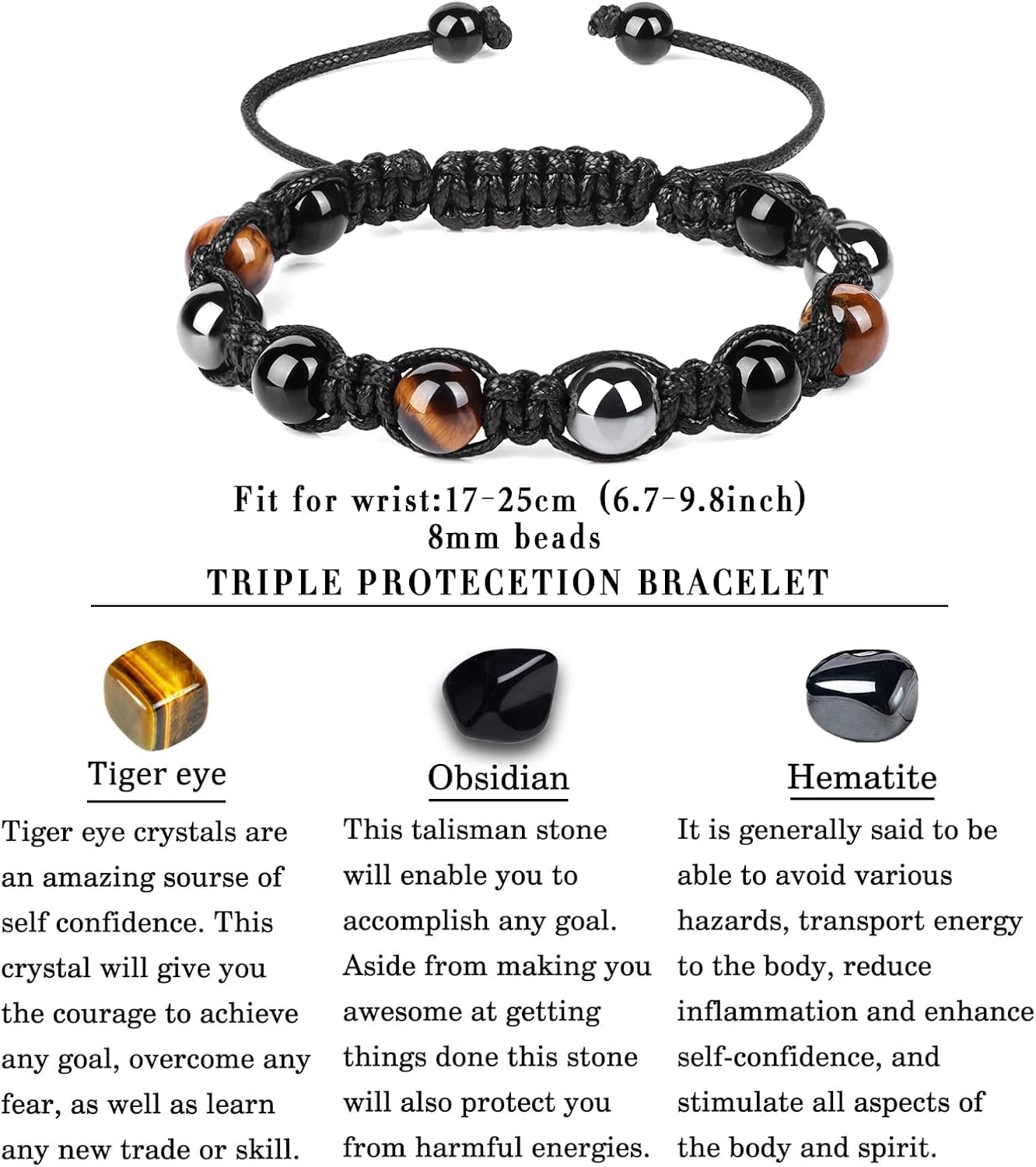 ✅PHENOMENAL SPIRITUAL ENERGY – This triple protection bracelet consists of genuine tiger eye, hematite and black obsidian stones which are known for their great spiritual protection energy. By cleaning and recharging some of your chakras, they will boost your confidence and enhance self-esteem, and improve your insights, while relaxing you to gain peace. Activate your inner strength by wearing this healing crystal bracelet of power, protection, and balance.