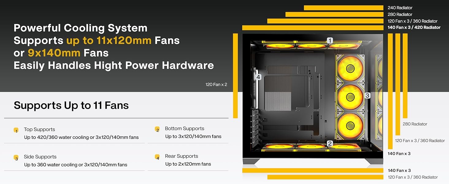 [Tower Case with Powerful Space Layout]The H09 gaming case features an ANSAITE-optimized internal structure with meticulously planned compartments. Installation is seamless, allowing users to customize their build freely and fully immerse in gaming! Compatible with mainstream hardware: Supports graphics cards up to 460mm (18.11 inches), CPU coolers up to 175mm in height, 420mm /360mm radiators on top, and power supplies up to 220mm in length;Equipped with mechanical hard drive and solid-state drive brackets; features 7 expandable PCIe slots; accommodates up to 11x 120mm case fans and 3 sets of side-by-side radiators.