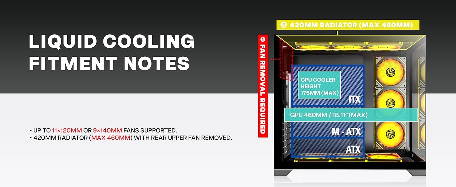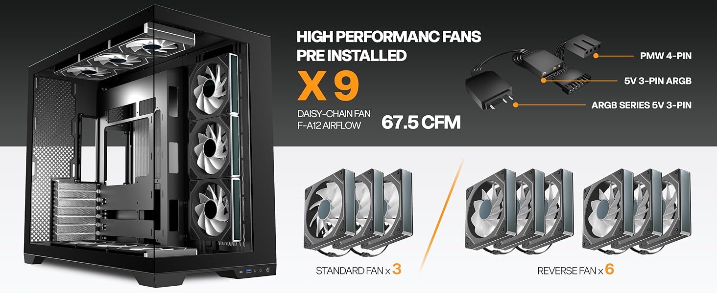 [Pre-installed 9 PWM ARGB Prism Fans] Top pre-installed with 3×120mm forward-blade fans, bottom pre-installed with 3×120mm reverse-blade fans (H12R ARGB PWM), side panel pre-installed with 3×120mm reverse fans (reverse-blade design combines aesthetics with intake cooling efficiency).