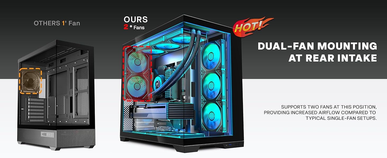 [Powerful Airflow Cooling]H09 PC Case utilizes a more-channel airflow design—horizontal for CPU—to deliver focused and efficient cooling. with the top serving as the main exhaust, create a vertical airflow design. Both the top and bottom of H09 mid-tower ATX case feature magnetic dust filters, maintaining cooling performance while minimizing internal dust accumulation.