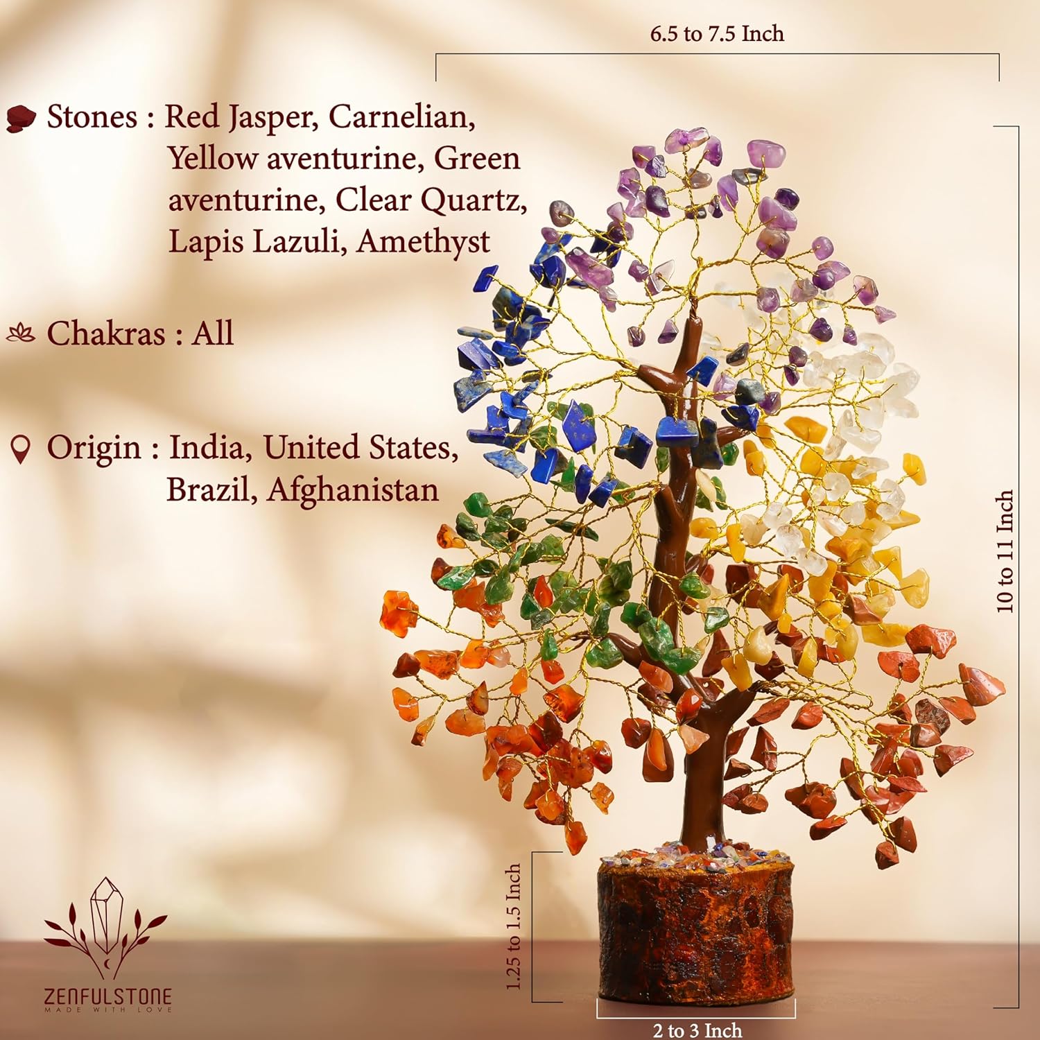 ELEGANT 7 CHAKRA CRYSTAL TREE (10-12 INCH) — SPIRITUAL CENTERPIECE Handcrafted with genuine chakra stones (Red Jasper, Carnelian, Yellow Aventurine, Green Aventurine, Lapis Lazuli, Amethyst, Clear Quartz) on golden metal wire. Perfect for living rooms, offices, or meditation spaces.