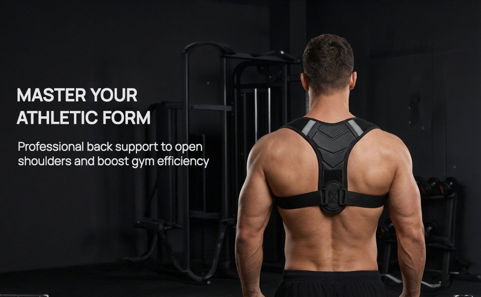 ENHANCE GYM EFFICIENCY & SCAPULAR ALIGNMENT Slumped shoulders reduce the mechanical advantage of your lifts. Our specialized back straps for posture brace for men encourage a “chest-up” position, optimized for back posture correction. By stabilizing the scapula, it helps maintain 90° alignment, optimally improving muscle engagement in rows for safer, more efficient athletic gains
