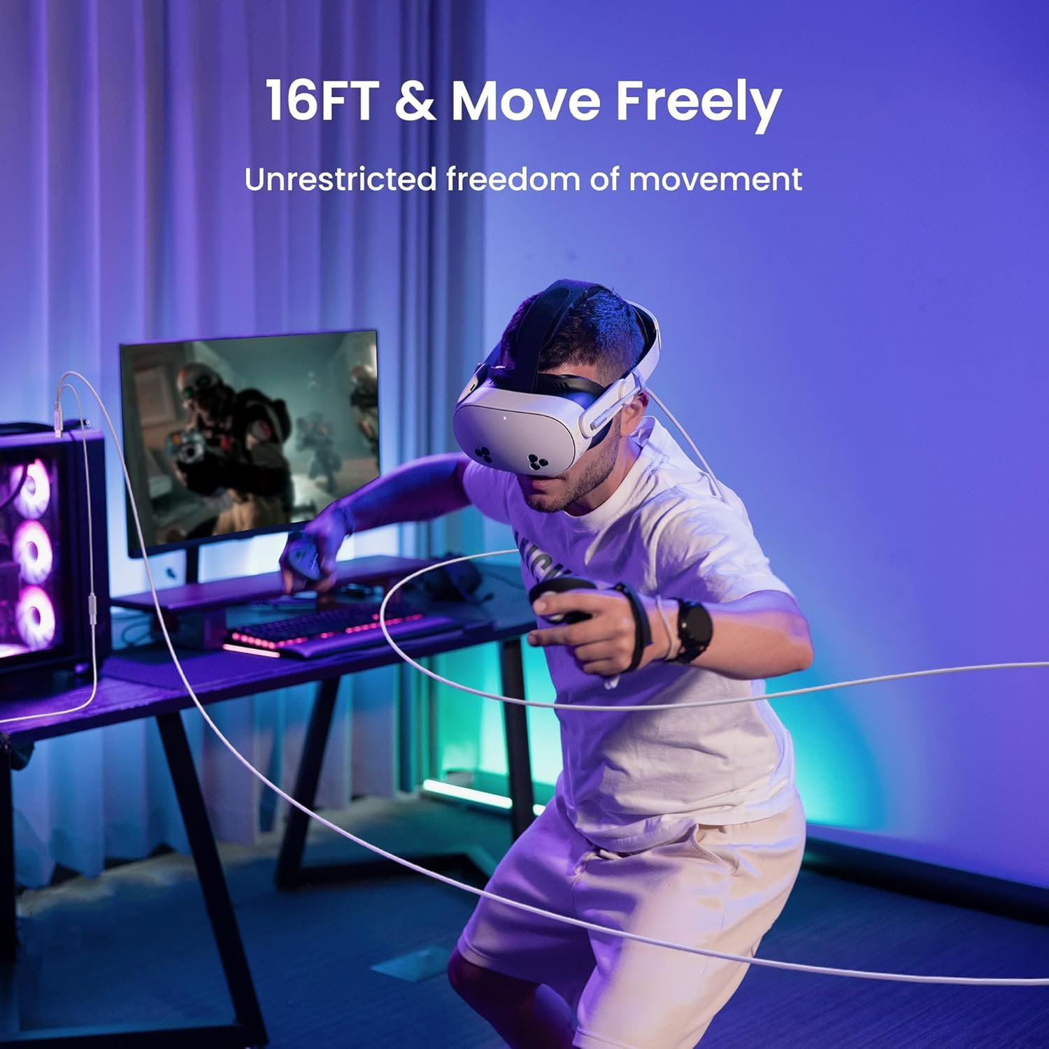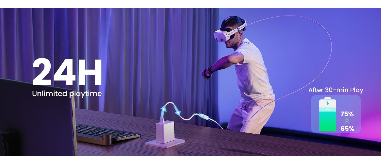 Review: For those of us who enjoy PCVR this affordable cable allows you play incredible games in VR. With 16 ft of cable there is plenty of space for you to play while the cable is attached to your computer. I have experienced no latency. And the added benefit of this cable is the addition of a plug-in so u can maintain power to your hungry Quest3/3S. There is no reason to spend a fortune while this affordable cable and plug-in can do a great job and maintain power to the Quests. I highly recommend this cable for other PCVR enthusiasts