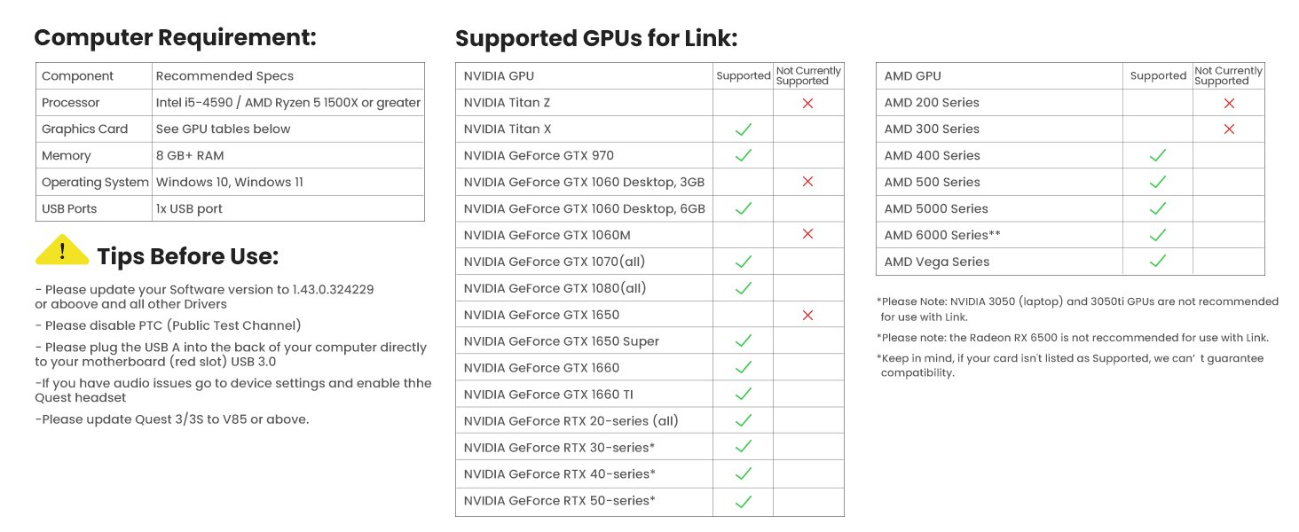 Compatible Devices ‎Meta Quest 3/3S, PC, PCVR, Please Ensure WIFI Stable