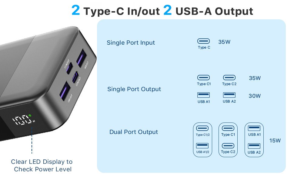 | Whats in the box | 20000mAh/35W Power Bank * 1, 3A Type-C to Type-C charging cable 30cm * 1, Instruction Manual * 1 |