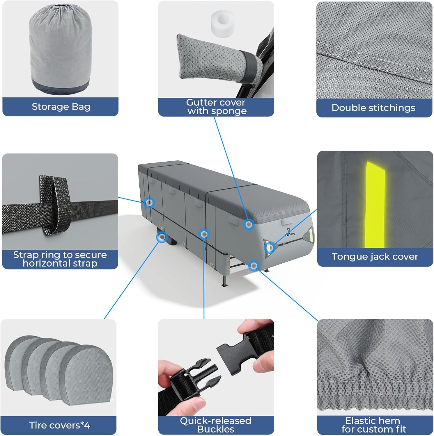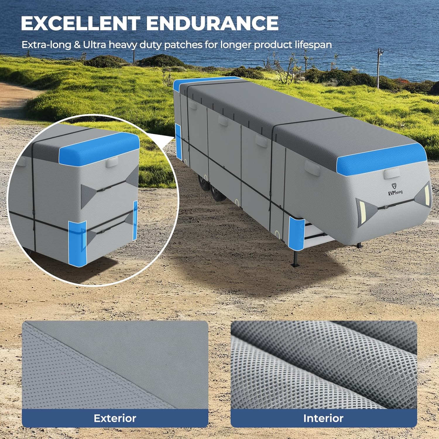 - 30% Increased Durability – Upgraded from old version with only small patches on 4 or 8 bottom corners, our 5th wheel rv cover protect 8 corners with extra-long reinforced patches. Larger patches design minimizes the risk of punctures and tearing from sharp edges. Plus, The rear corner patches are heightened to protect against ladder edges, further preventing tears. With thicker fabric and thoughtful design, we ensure better user experience and product lifespan