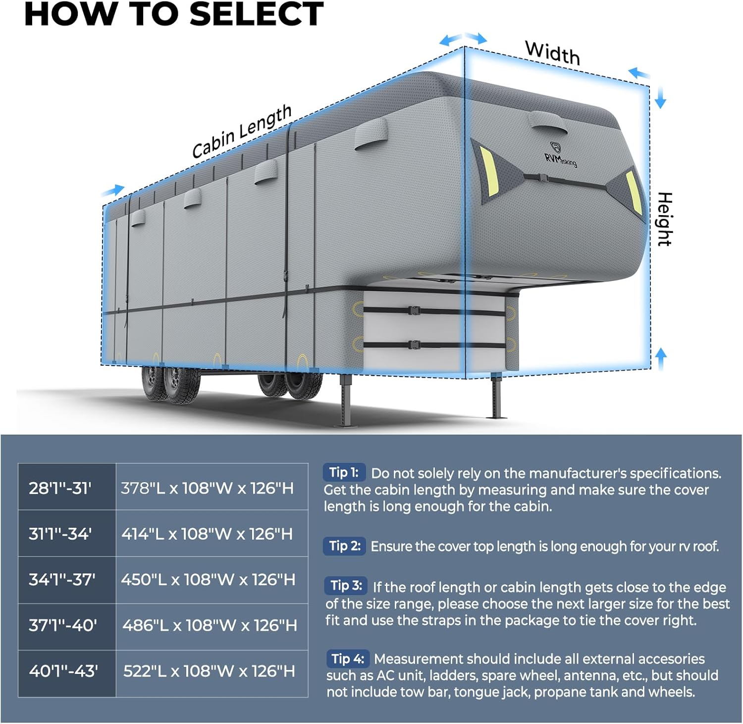 - Support & Complete Kit – Backed by 24-month product support and weekday 24hr service. Each kit comes ready to install and includes 1*34’1″-37′ 5th wheel trailer cover; 4*tire covers; 1*horizontal long strap; 2*over roof strap; 8*bottom windproof strap; 3*panel straps; 1*storage bag; 6*gutter covers; 1*adhesive repair patch; 2*weighted toss metal stick. Please measure your RV before purchase for the right size