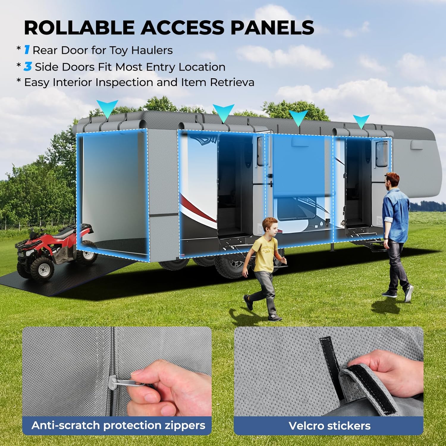 - Access Upgraded & Ventilation – Besides 3 zippered roll-up side panels for easy interior checks and loading, there are also 1 rear zippers panels designed for 5th wheel toy hauler trailers, easily load/unload large outdoor items like bikes and motorcycles. Suitable for most entry doors. Featuring 10 vents on the sides and ends, our cover promotes airflow to keep the interior dry and balances air pressure, preventing moisture buildup