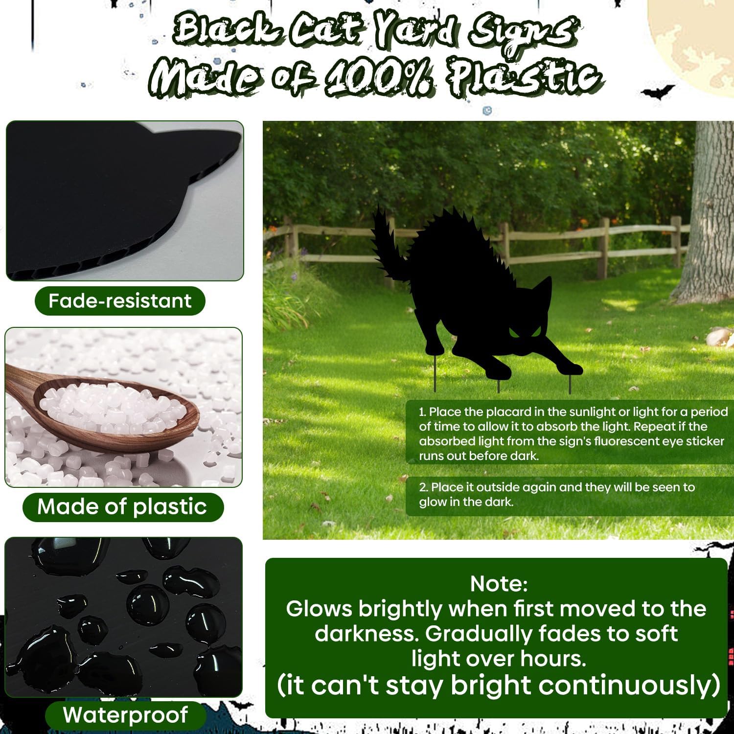 • 【 Easy Assembly & Reusable Design 】 Setting up is quick and tool-free! Simply attach two glow-in-the-dark eye stickers to each cat, insert two stakes into the sign, and press firmly into the ground. For harder soil, lightly moisten it first. These decorations are designed for effortless storage and repeated use.