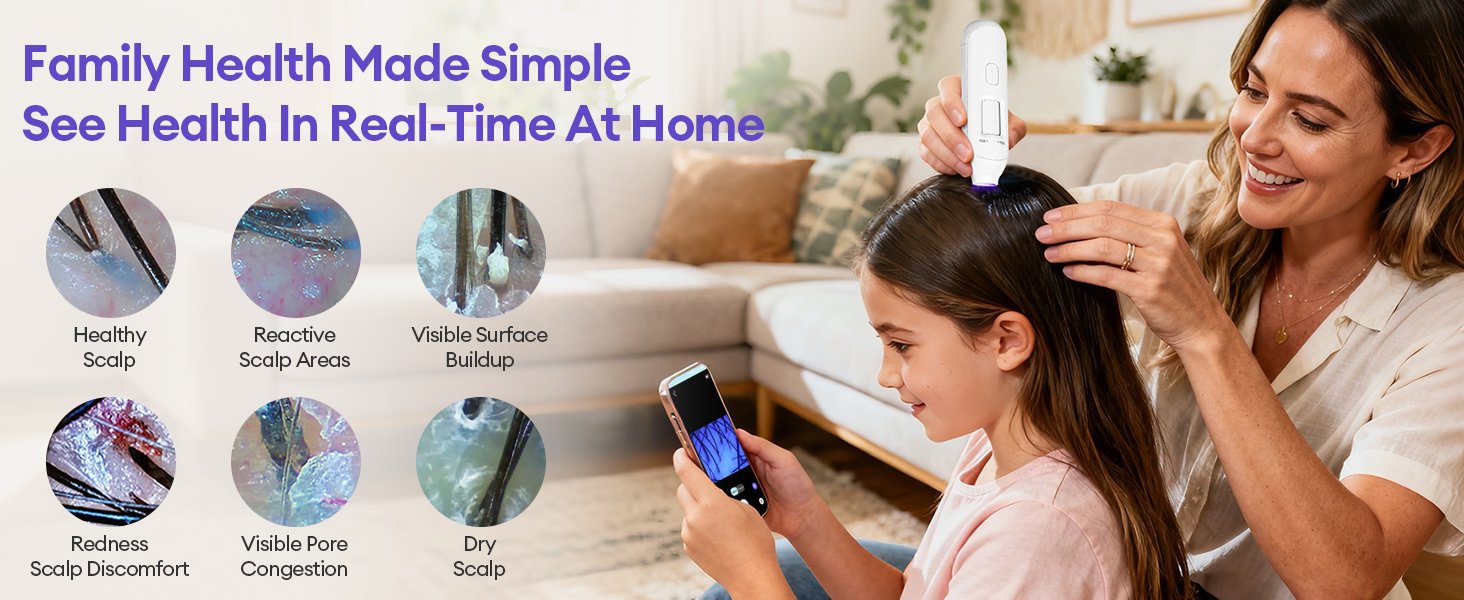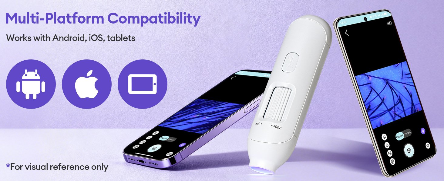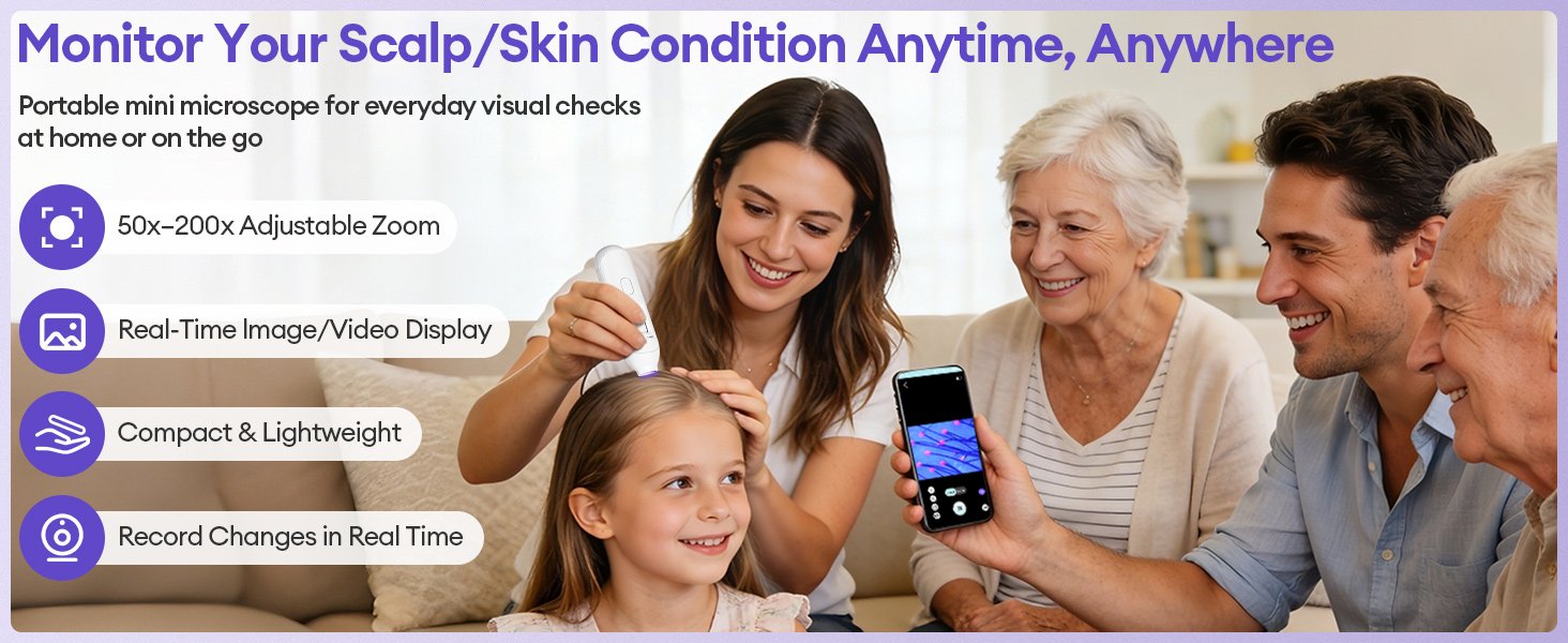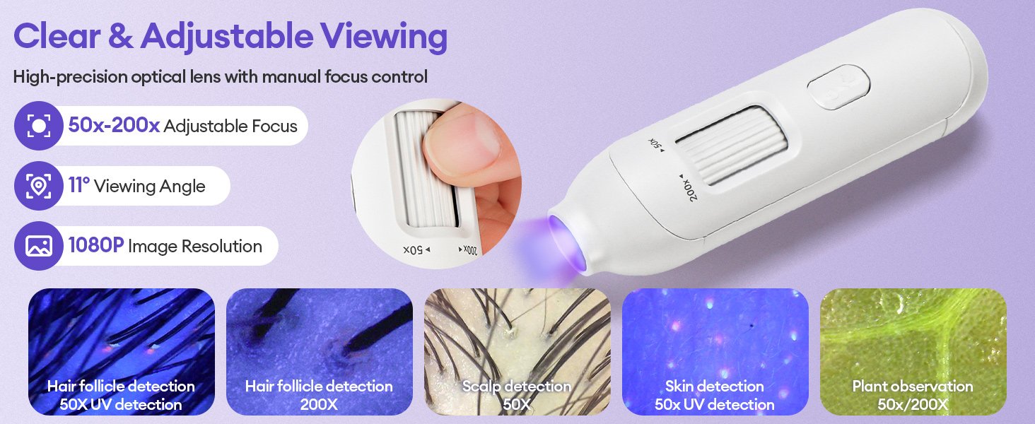Adjustable 50X–200X Magnification:Manual focus control allows flexible magnification for close-up viewing of scalp, hair, skin surface, pets, plants, and small objects.Designed for casual scalp and hair surface viewing, home use, education, and hobby exploration. A portable microscope suitable for beginners and families.